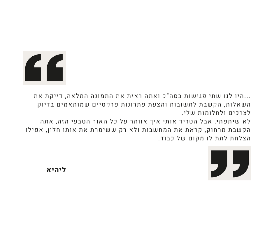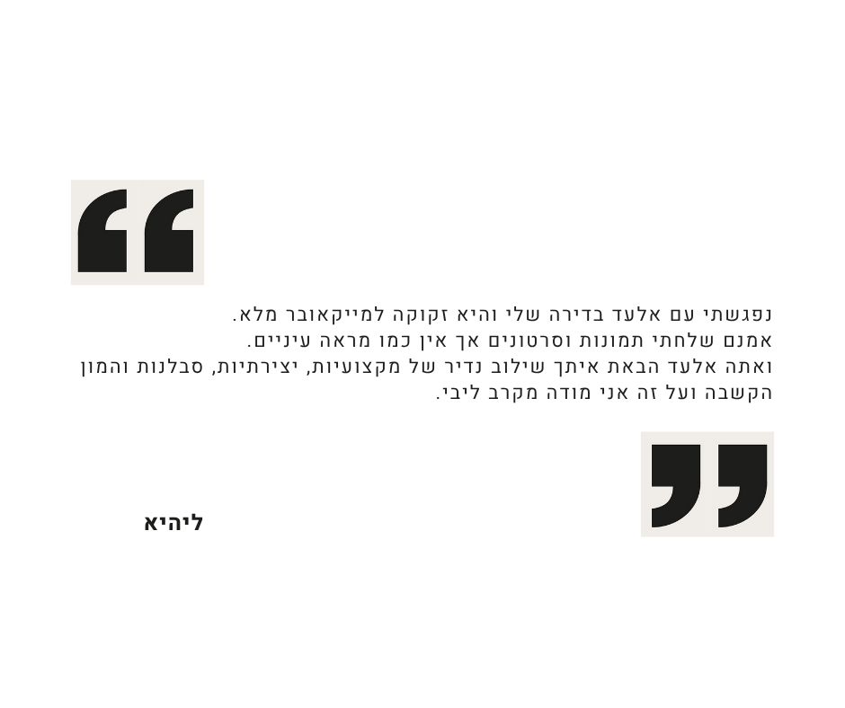 אנחנו יוצרים חללים שמחזירים לבית תחושת שקט, איזון, והרמוניה דרך עיצוב מדוייק, מינימליסטי, ומחובר לטבע. הבית הוא קנבס לחיים עצמם: מקום בו אפשר לנשום, לנוע, ולחיות בפשטות. בכל פרוייקט אנחנו מלווים את הלקוח בתהליך אישי וקשוב, שבו הוא שותף מלא ליצירה. הקשר הישיר והאנושי בינינו הוא זה שמאפשר להגיע לתוצאה עמוקה, אמיתית, ומותאמת באמת